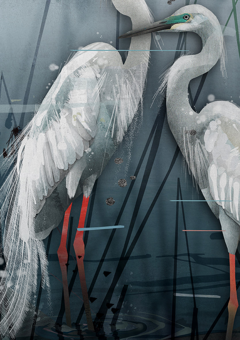 Two Great Egrets stand in the shallows of a misty lake, their all-white plumage luminous against the soft grey-blue water. Extraordinary aigrette feathers cascade from their backs like living silk, long and lace-like, trailing softly behind them. At the base of their faces, their lores glow vivid lime green — the brief and intimate flush of mating season. They face one another in quiet communion, a sacred partnership, patient and unhurried, as if mid-conversation in a language older than words.